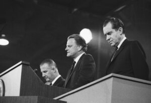 האוונגליסט האמריקאי בילי גרהם (במרכז) והנשיא ריצ'רד ניקסון (מימין) בתור גרהם מוביל תפילה מהדוכן ביום האחרון של הוועידה הלאומית הרפובליקנית ב-1968. צילום מאת Graphic House / Hulton Archive / Getty Images