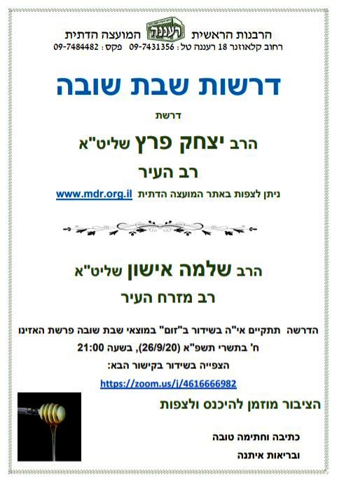 דרשות שבת תשובה מותאמות השנה לתקופת הקורונה. בשיעורו של רב העיר, הרב יצחק פרץ ניתן לצפות באתר המועצה הדתית רעננה www.mdr.org.il.