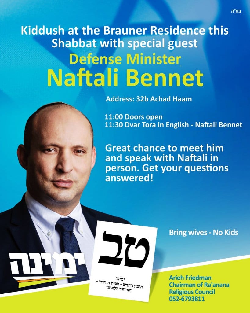שר הביטחון נפתלי בנט יתארח השבת בכתריסר בתי כנסת וכנסים ברחבי רעננה. הקהילות שנבחרו משקפים את הרכב האוכלוסיה הדתית-ציונית ברעננה.