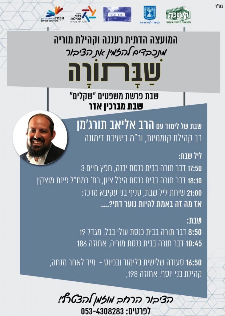 במסגרת סדרת "שבתורה" של המועצה הדתית רעננה וקהילת “מוריה” יתארח השבת ברעננה הרב אליאב תורג'מן, רב קהילת "קוממיות" ור"מ בישיבת