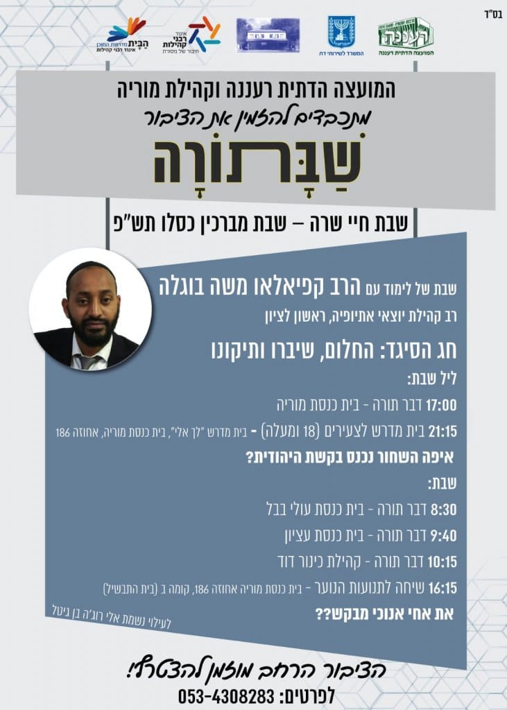 במסגרת סדרת "שבתורה" של המועצה הדתית רעננה וקהילת “מוריה” יתארח השבת ברעננה הרב קפיאלאו משה בוגלה, רב קהילת יוצאי אתיופיה,