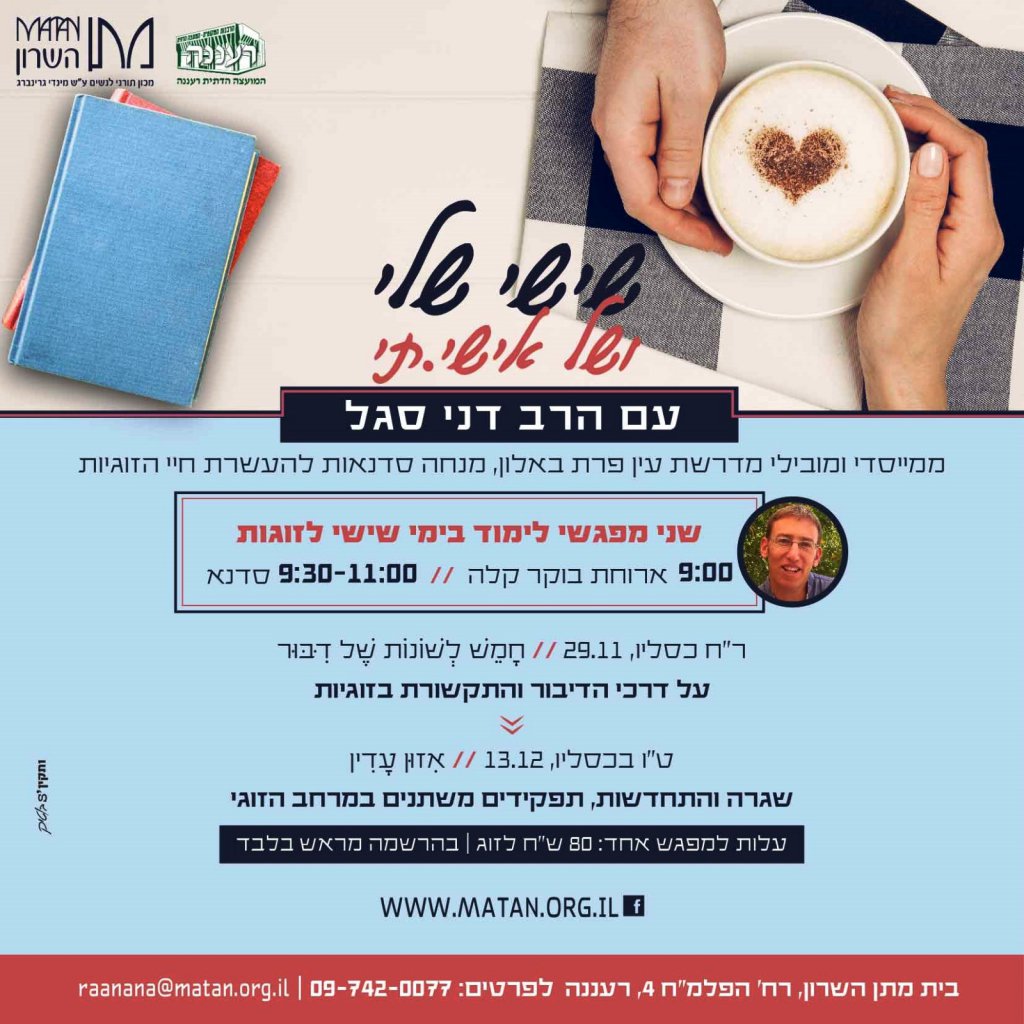 מפגשי לימוד לזוגות "שישי שלי ושל אישי/תי" – הרב דני סגל, ממייסדי ומובילי מדרשת עין פרת באלון, מנחה סדנאות העשרה