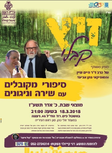 הציבור מוזמן ל"זיץ קבלי" במוצאי שבת, כ'אדר, 18/3, בשעה 21:00. ערב של שירים, ניגונים וסיפורי מקובלים בהנחייתו של הרב דר' חיים שיין והמוסיקאי נתן אביעד.