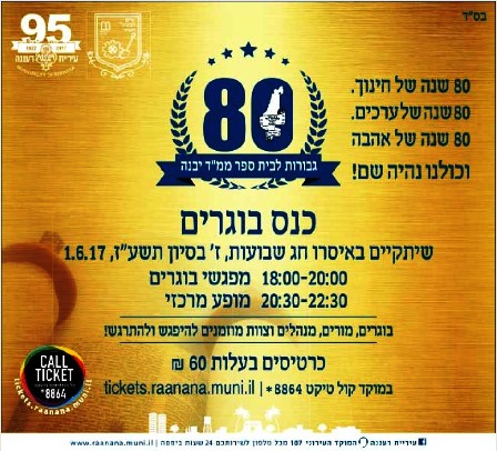 כנס בוגרי ממ"ד "יבנה" יצא לדרך! במסגרת חגיגות שנות ה 80 לבית הספר יתקיים באיסרו חג שבועות, ז' סיון, ה 1.6.17, כנס בוגרים. כולם מגיעים: בוגרים, מורים, מנהלים וצוות – כולם מוזמנים להיפגש ולהתרגש! לרכישת הכרטיסים כנסו ל"קול טיקט" באתר עיריית רעננה.