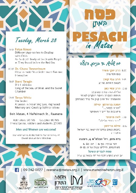 יום עיון לקראת פסח יתקיים בעז"ה ביום שלישי, א' ניסן, 28/3, בבית מת"ן השרון. יום העיון פתוח לגברים ולנשים.