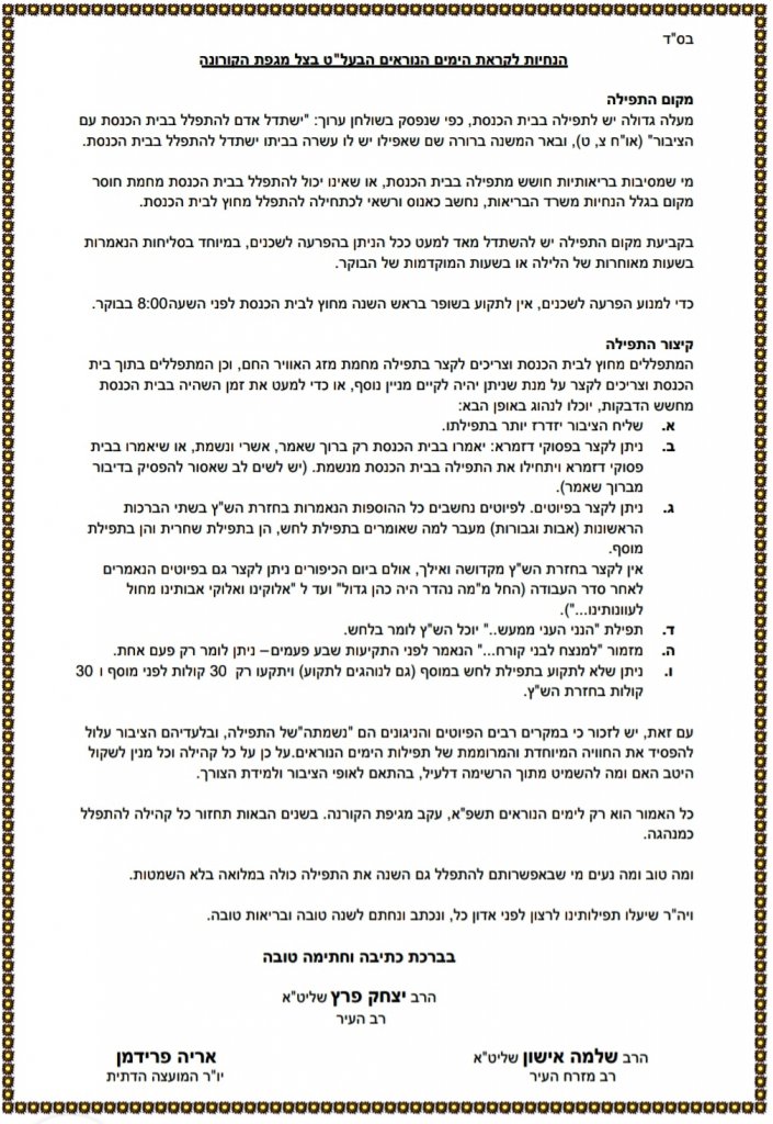 רבנות רעננה הוציאה הנחיות הלכתיות לקראת הימים הנוראים בצל מגפת הקורונה מתוך הבנה שיש לקצר ככל האפשר את זמן ההתקהלות.