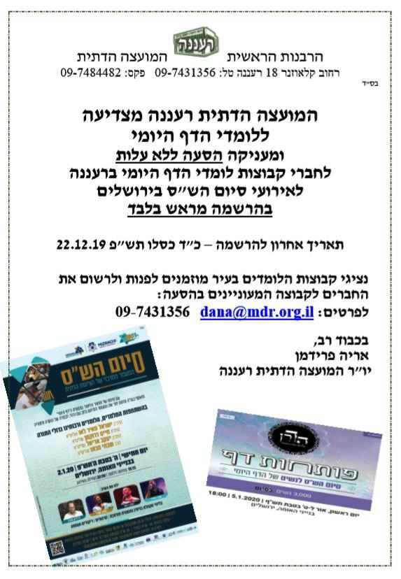 יוזמה חדשה של המועצה הדתית רעננה – הסעות ללא עלות לאירועי סיום הש"ס בירושלים. קבוצות לומדי הדף היומי המעוניינות להשתתף