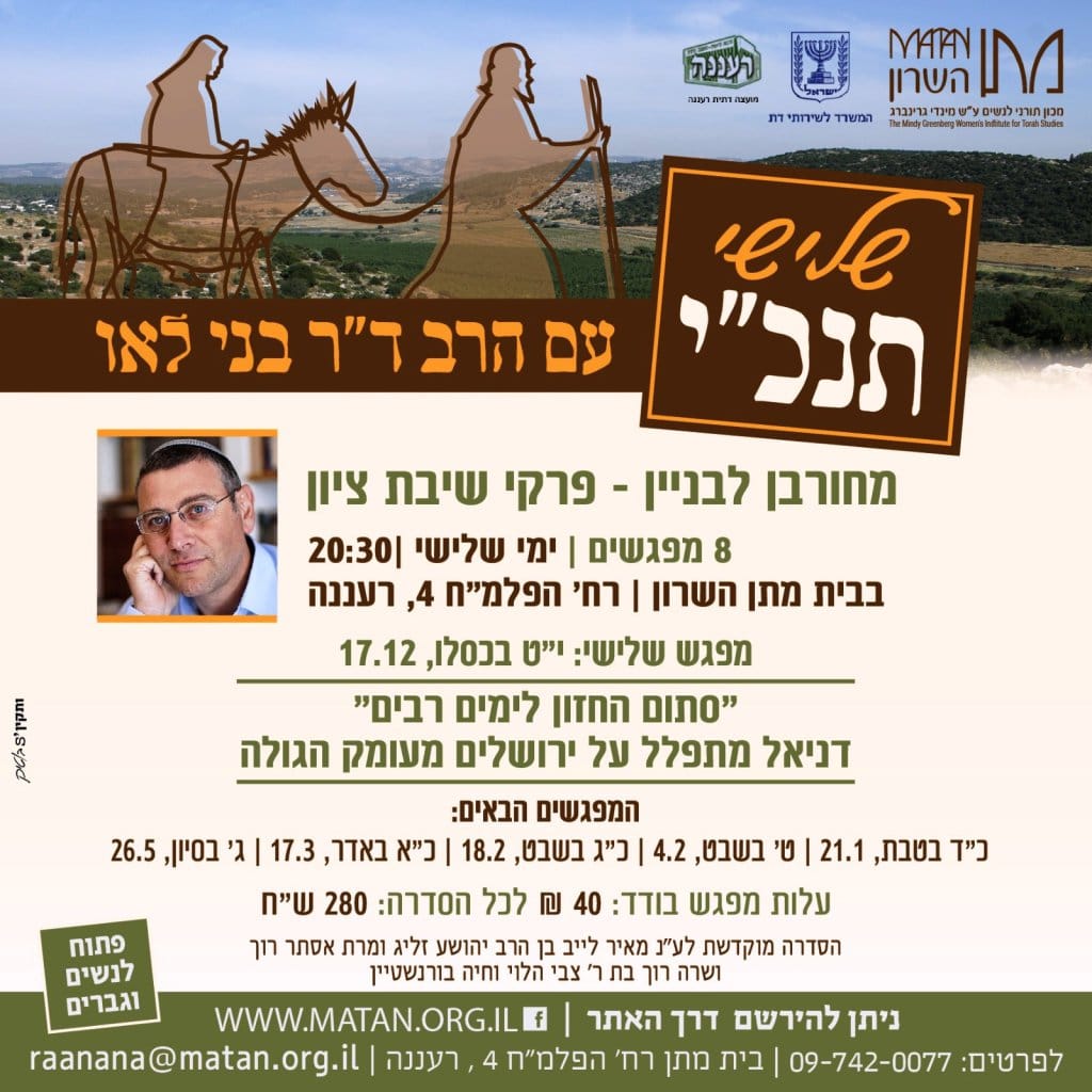 פעם בחודש, במסגרת הסידרה "שלישי תנכי", מעביר הרב בני לאו שיעור בנושא "פרקי שיבת ציון – מחורבן לגאולה". המפגש השלישי
