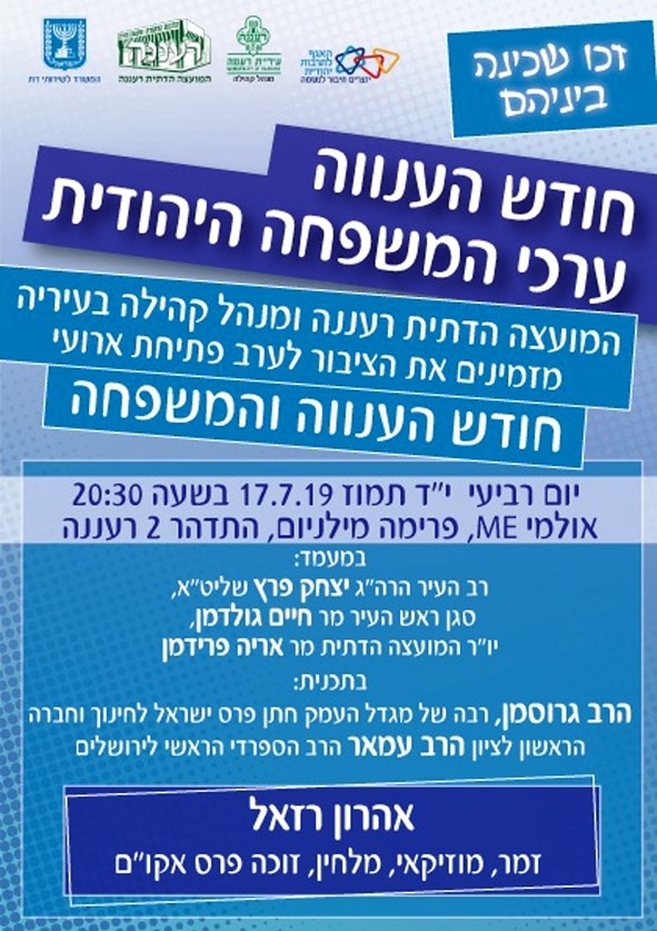 ערב הפתיחה של חודש הענווה וערכי המשפחה היהודית יתקיים ביום רביעי, אור לט"ו בתמוז, ה 17.7 בשעה 20:30 באולמי ME במלון פרימה,