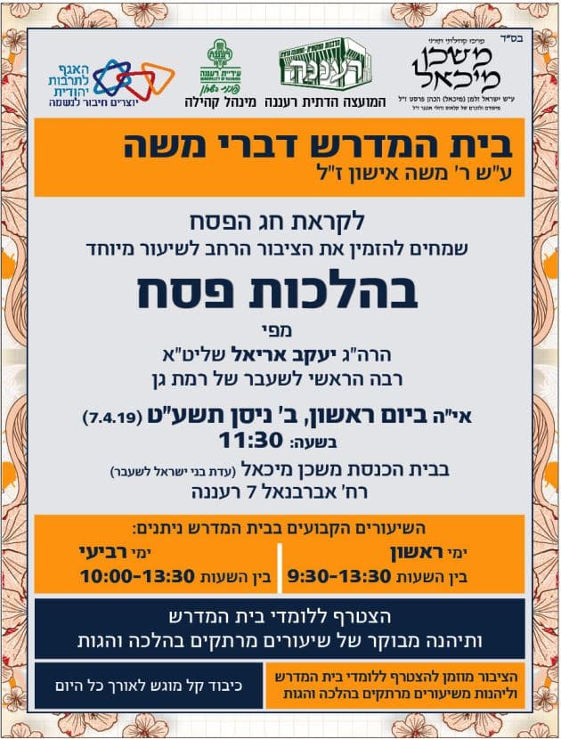 לקראת חג הפסח, יתן הרב יעקב אריאל, לשעבר הרב הראשי לרמת גן, שיעור מיוחד בהלכות פסח בבית המדרש “דברי משה”