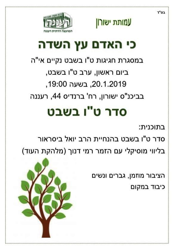 קהילת בית כנסת "ישורון" ומועצה הדתית רעננה מזמינים את הציבור הרחב לסדר ט"ו בשבט בהשתתפות הרב יואל ביסראור והזמר רמי