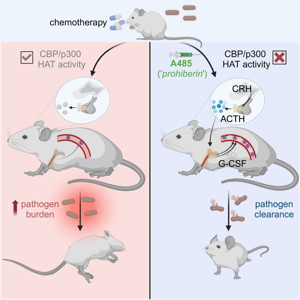 "עיכוב תחרותי, הפיך, בתיווך מולקולה קטנה של תחום ה-CBP/p300 HAT מפעיל גיוס לויקוציטים אקוטי וחולף ממח העצםדרוש מחקר נוסף כדי לזהות אילו הקשרים קליניים הם אידיאליים לתרופה זו. A485 עשוי להיות טוב יותר אם נדרשת רק עלייה קצרה ומהירה של נויטרופילים, בעוד שהחלמה ארוכת טווח של ייצור תאי דם במח העצם עשויה לדרוש G- CSF.