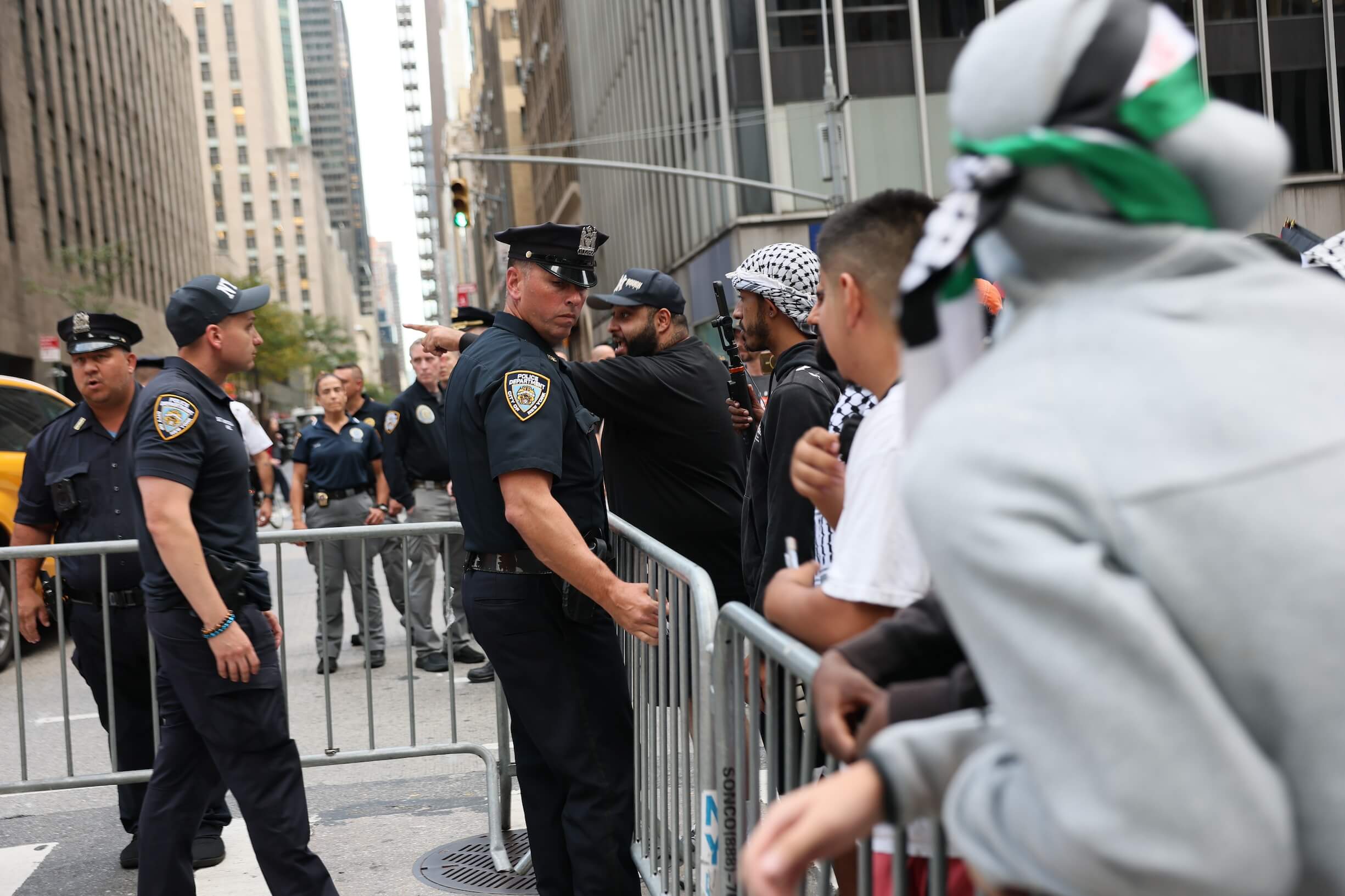 קציני NYPD מציבים בריקדות מול מפגינים פרו-פלסטינים ב-07 באוקטובר 2025. תמונה מאת Michael M. Santiago/Getty Images