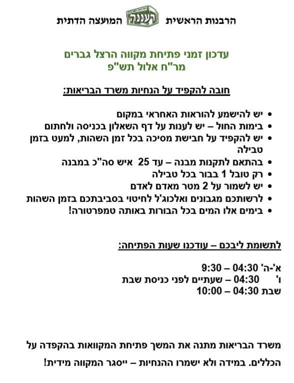 לקראת חודש הסליחות העומד בפתח פרסמה המועצה הדתית רעננה עדכון לשעות הפתיחה של מקווה הרצל הפתוח תחת תקנות הקורונה ומגבלות משרד הבריאות. יו"ר המועצה אריה פרידמן: "שעת הפתיחה הוקדמה בשעה כדי לאפשר טבילה לפני אמירת הסליחות".