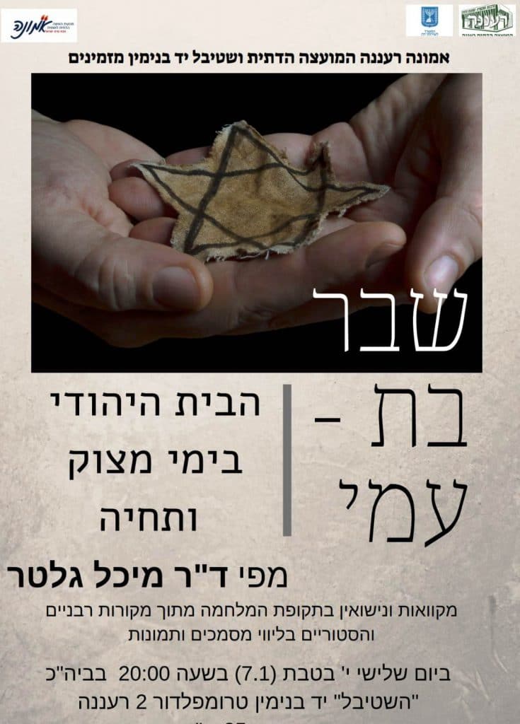 אמונה רעננה, המועצה הדתית וקהילת "שטיבל יד בנימין" מזמינים את הציבור להרצאה בליל עשרה בטבת מפי ד"ר מיכל גלטר בנושא "הבית היהודי בימי מצוק ותחיה" על טהרת המשפחה בימי מלחמה . יום שלישי, י' טבת, ה 7.1, בשעה 20:00 בבית הכנסת "שטיבל יד בנימין".