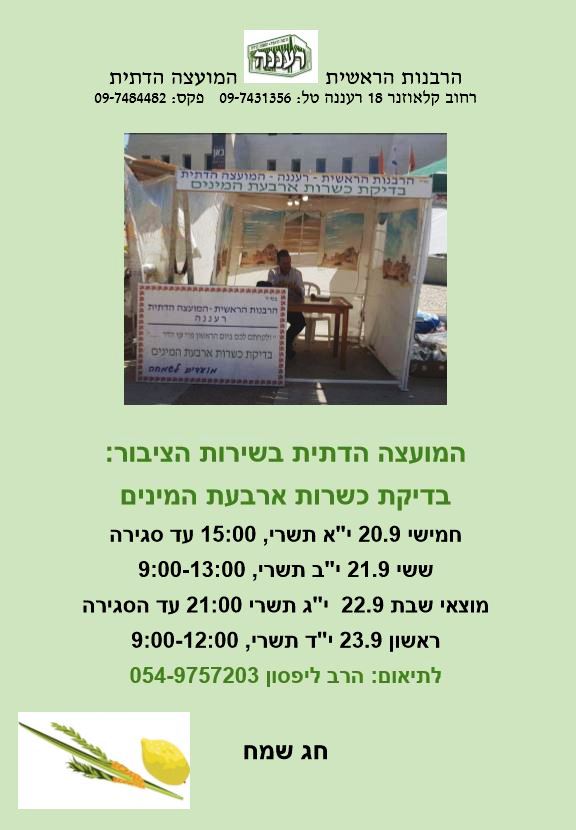 דתילי רעננה מבקר ביריד ארבעת המינים שעורכת עיריית רעננה ברחבת בית יד לבנים. לצד סוכת העיר הגדולה מתקיים שוק תוסס ותחרותי המוכר את כל צרכי החג – ארבעת המינים, סוכות, קישוטים ועוד. כמו כן ממוקמת במרכז השוק סוכת המועצה הדתית לכל שאלה ולמתן עזרה!