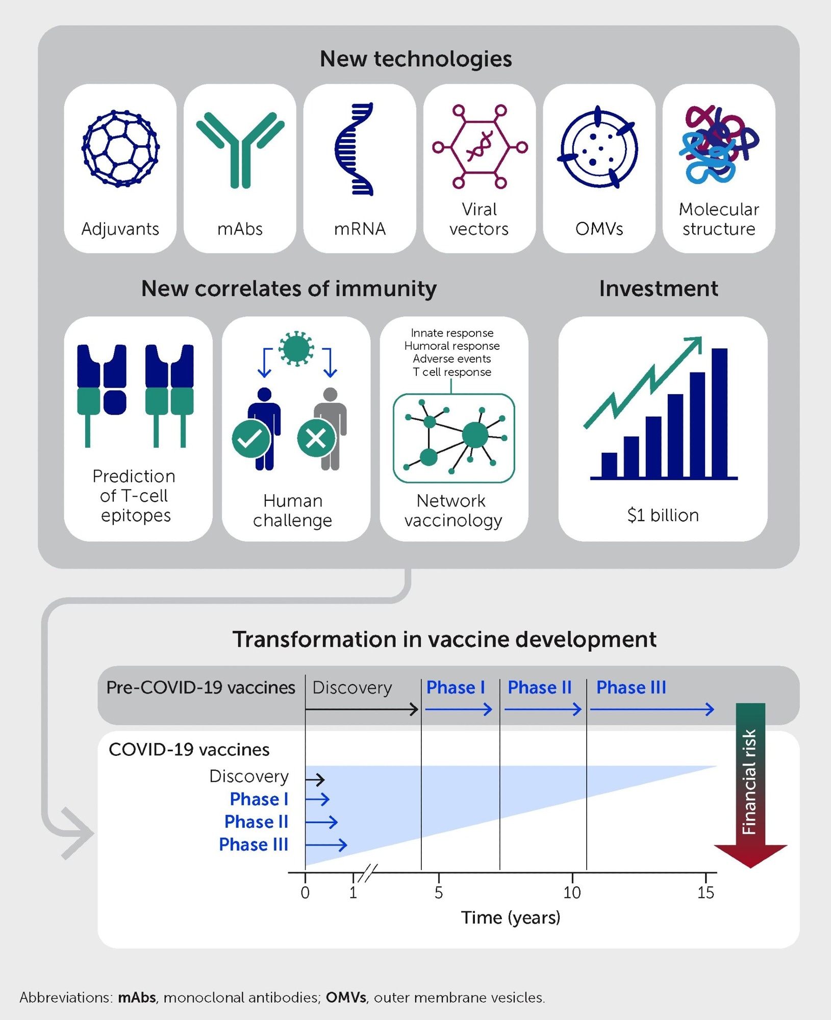 מגיפת COVID-19 שינתה באופן קיצוני את תהליך פיתוח החיסונים. טרום מגיפה, תהליך הפיתוח כלל שלבים עוקבים של גילוי, פיתוח מוקדם וניסויים קליניים שלב I-III על פני תקופה של 15 שנים בערך. עבור חיסוני COVID-19, טכנולוגיות חדשות, מתאמים חדשים של חסינות והשקעה ציבורית מוקדמת אפשרו להשלים את כל השלבים לביסוס בטיחות ויעילות במקביל תוך 10 חודשים ועם פחות סיכון פיננסי למפתחים.